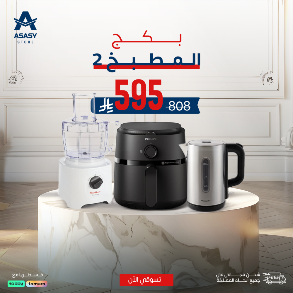 بكج المطبخ 2 يتألف من محضرة الطعام مولينكس، قلاية هوائية من فيليبس, غلاية كهربائية 2200 واط من باناسونيك