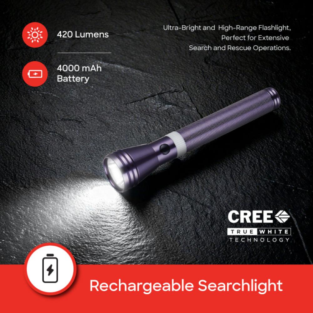 نطاق إضاءة ممتد: يُصدر ضوءًا يصل إلى 1800 متر، مثالي للرؤية لمسافات طويلة. عمر بطارية طويل: يعمل ببطارية ليثيوم قابلة لإعادة الشحن بسعة 4000 مللي أمبير/ساعة، توفر ما يصل إلى 200 دقيقة (3 ساعات و20 دقيقة) من التشغيل المتواصل.