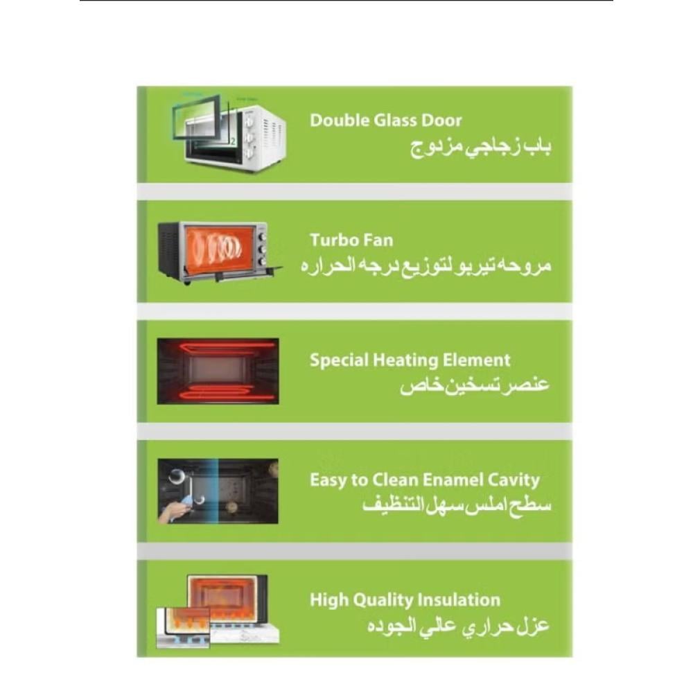 - وظائف متعددة: يتيح لك الفرن خيارات متعددة مثل الخبز، الشواء، التحميص والطهي بالحمل الحراري.
